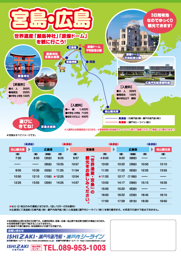 ※松山観光港乗船手続きの際、宮島訪問税(お1人様100円:現金)を別途お支払いください。